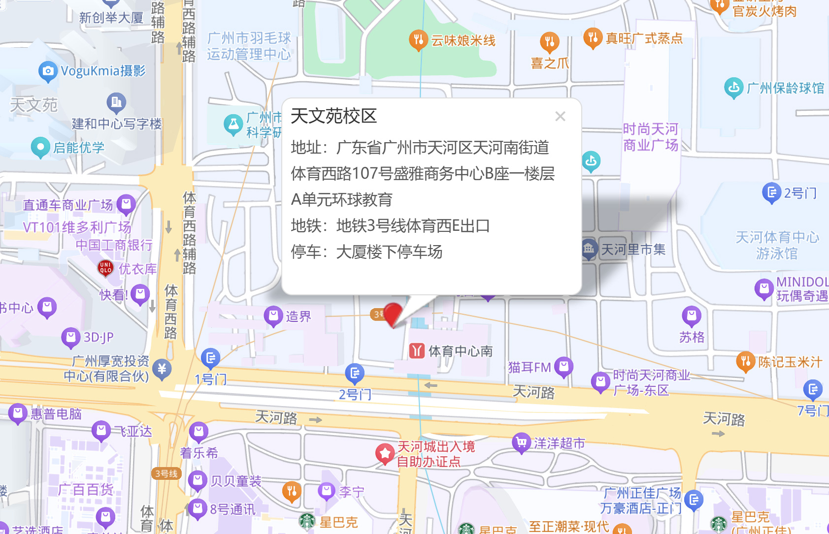 - 地址:广东省广州市天河区天河南街道体育西路107号盛雅商务中心B座一楼层A单元环球教育